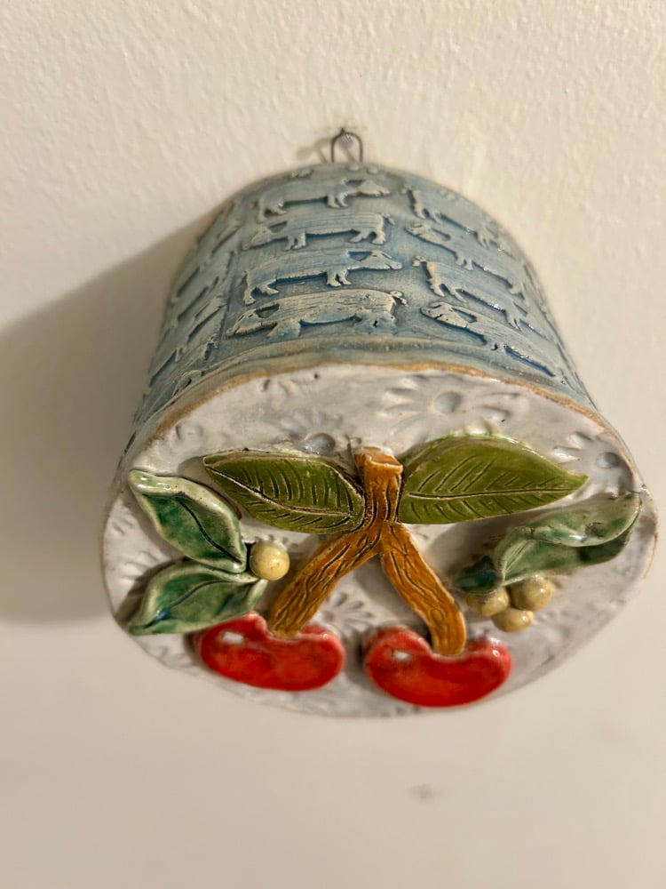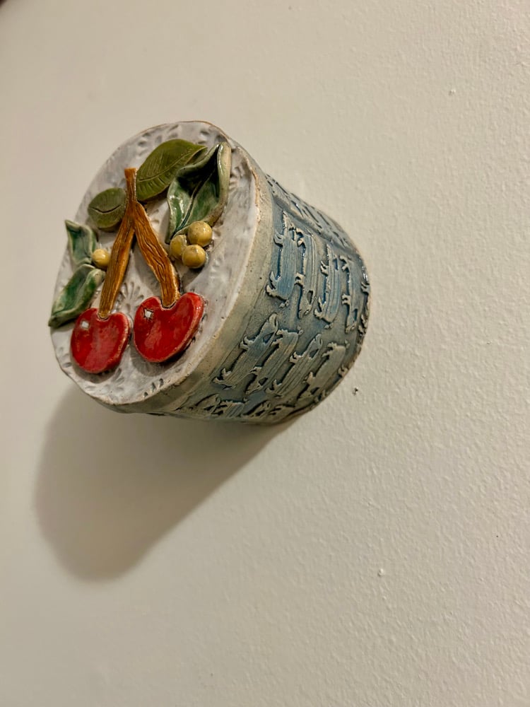 Rad cherries on a 3” by 4” round frame, stoneware. Ready to hang.