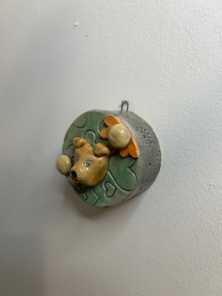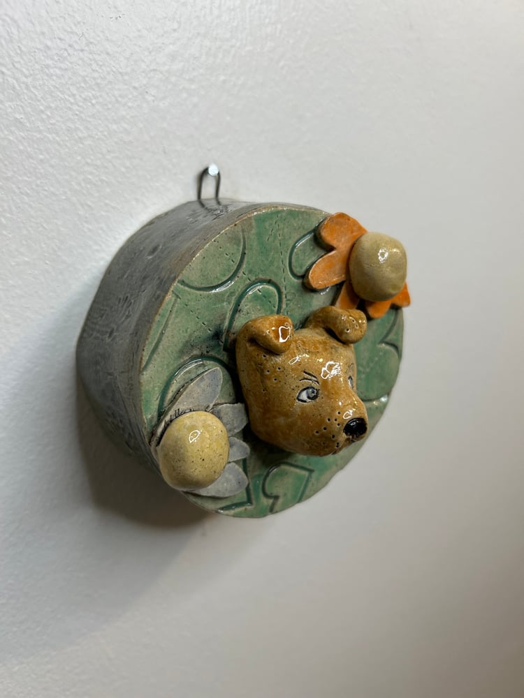 Little dog face on a round “frame” 3.5” round, 1.5” deep, ready to hang. Stoneware.
