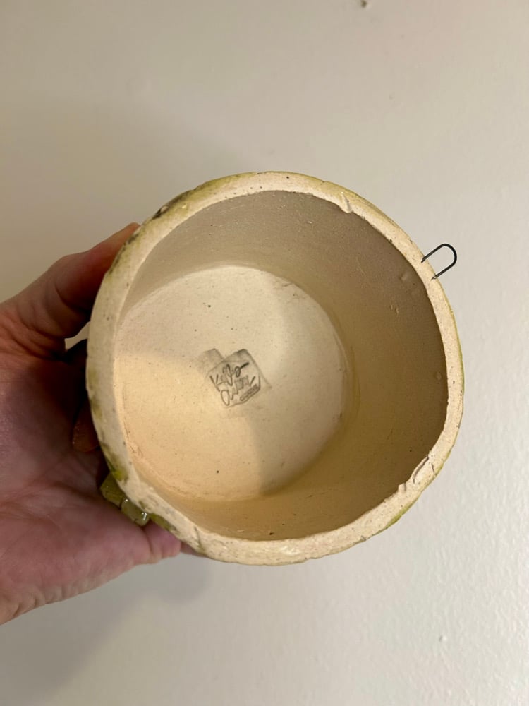 Little frog face on a round “frame” 3” round, 2” deep, ready to hang. Stoneware.
